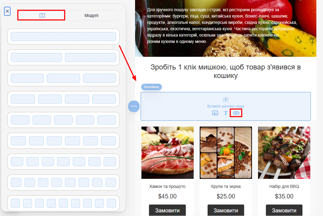 На бічній панелі Блоки знайдіть елемент Кнопка і перетягніть його в потрібний контейнер вашого листа.