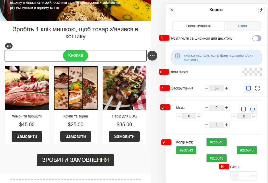 - Колір кнопки: колір фону кнопки.