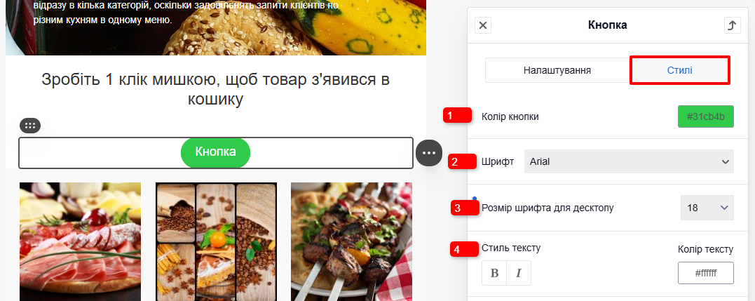 - Стиль та колір тексту: оформлення (наприклад, жирний, курсив) і колір тексту кнопки.
