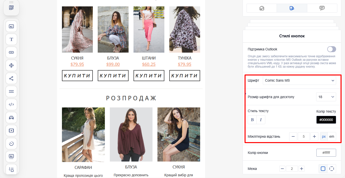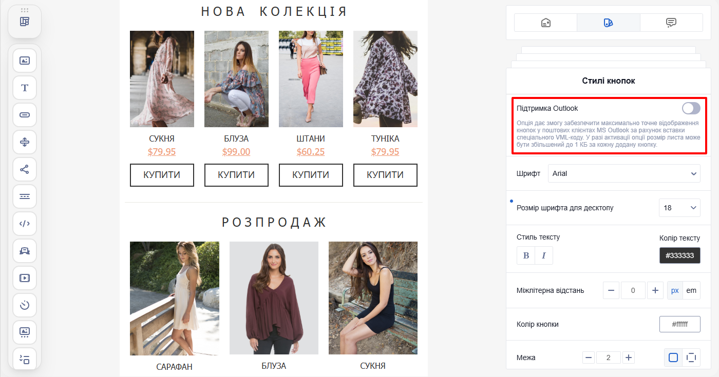 Оформлення листа визначає шрифти, кольори, фони, відступи, а також вигляд кнопок і заголовків. Налаштування застосовуються до всього повідомлення, що дає змогу швидко задати єдиний дизайн без редагування окремих елементів