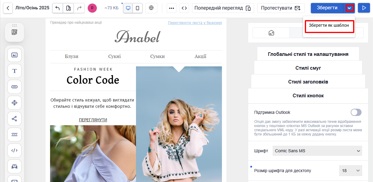 Щоб зберегти лист як шаблон, оберіть у меню Зберегти → Зберегти як шаблон.