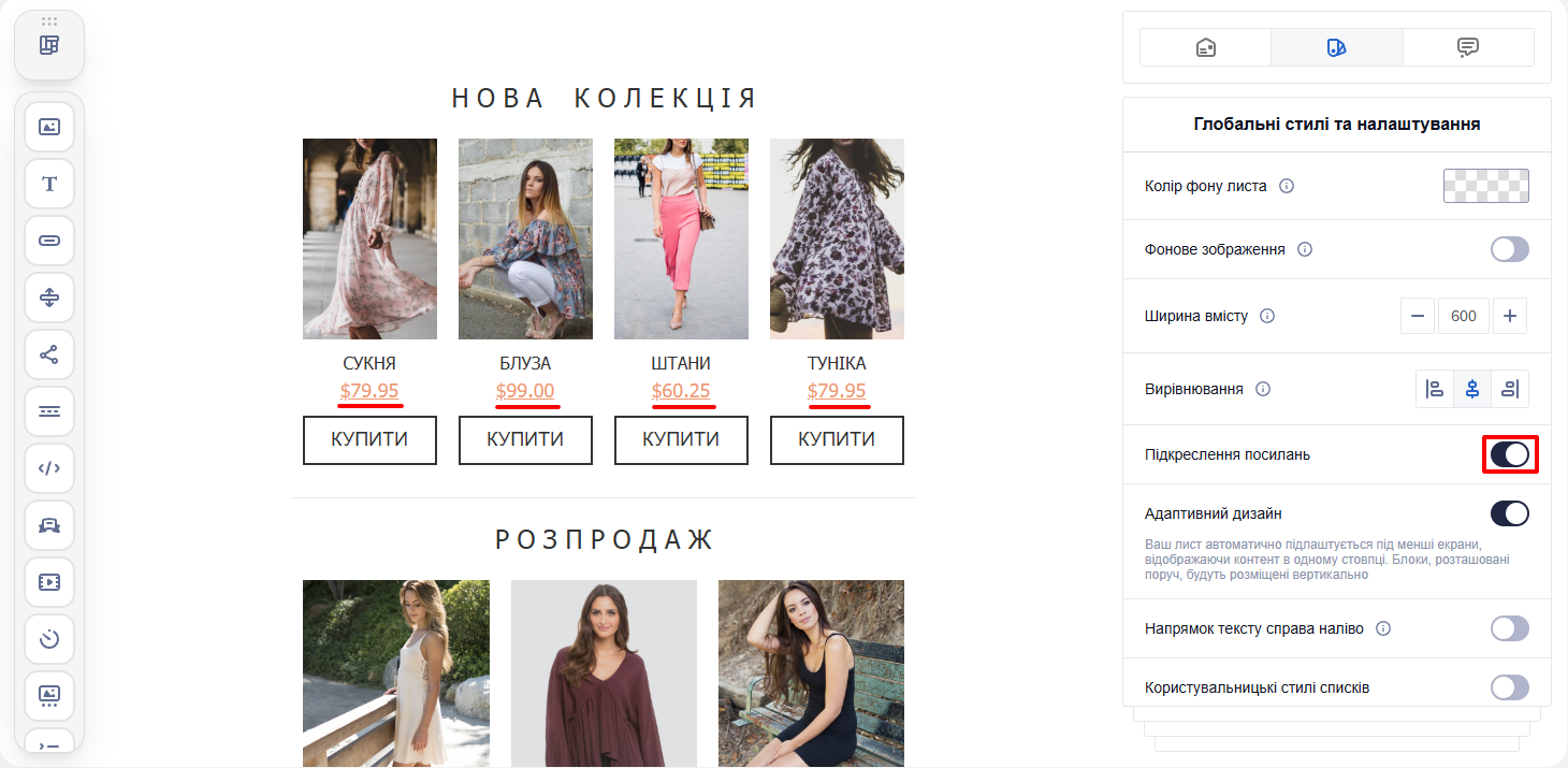 - Підкреслення посилань: відповідає за стилі гіперпосилань у повідомленні. За замовчуванням всі посилання підкреслені. Якщо підкреслення не потрібне — вимкніть перемикач.
