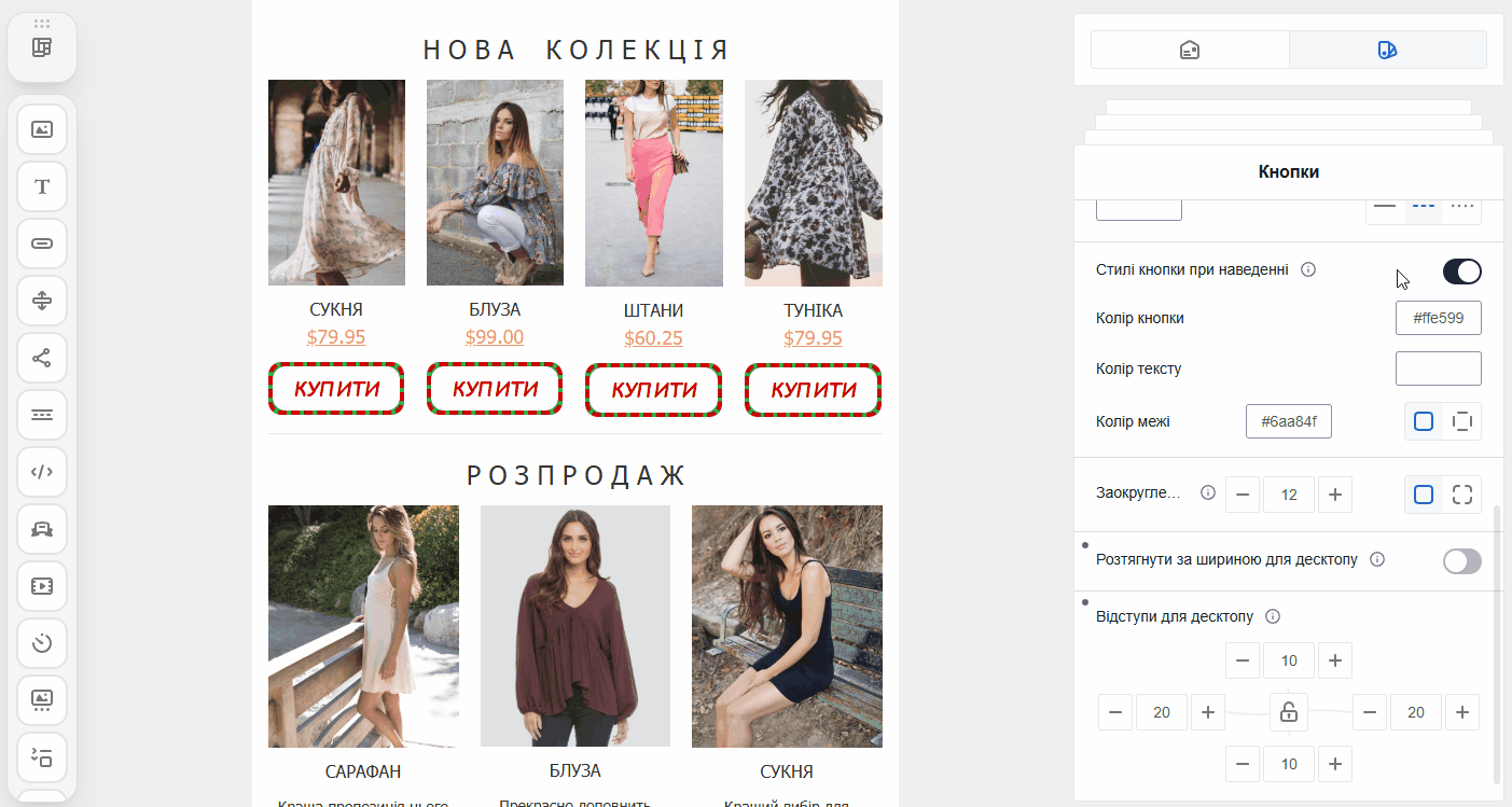 - Стилі кнопки при наведенні: дозволяють задати інший фон, колір тексту або рамки, які з’являються при наведенні курсора. Це робить кнопки інтерактивними та підкреслює їхню клікабельність.