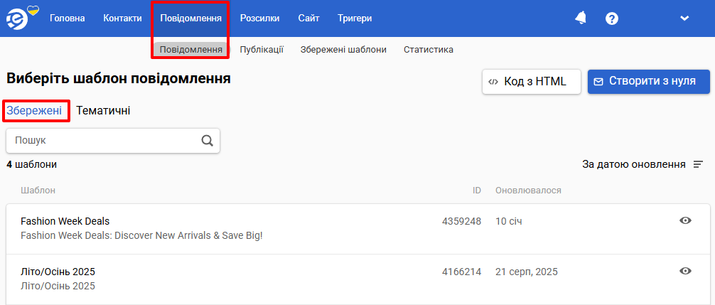Усі шаблони доступні в розділі Повідомлення → Повідомлення → Збережені.