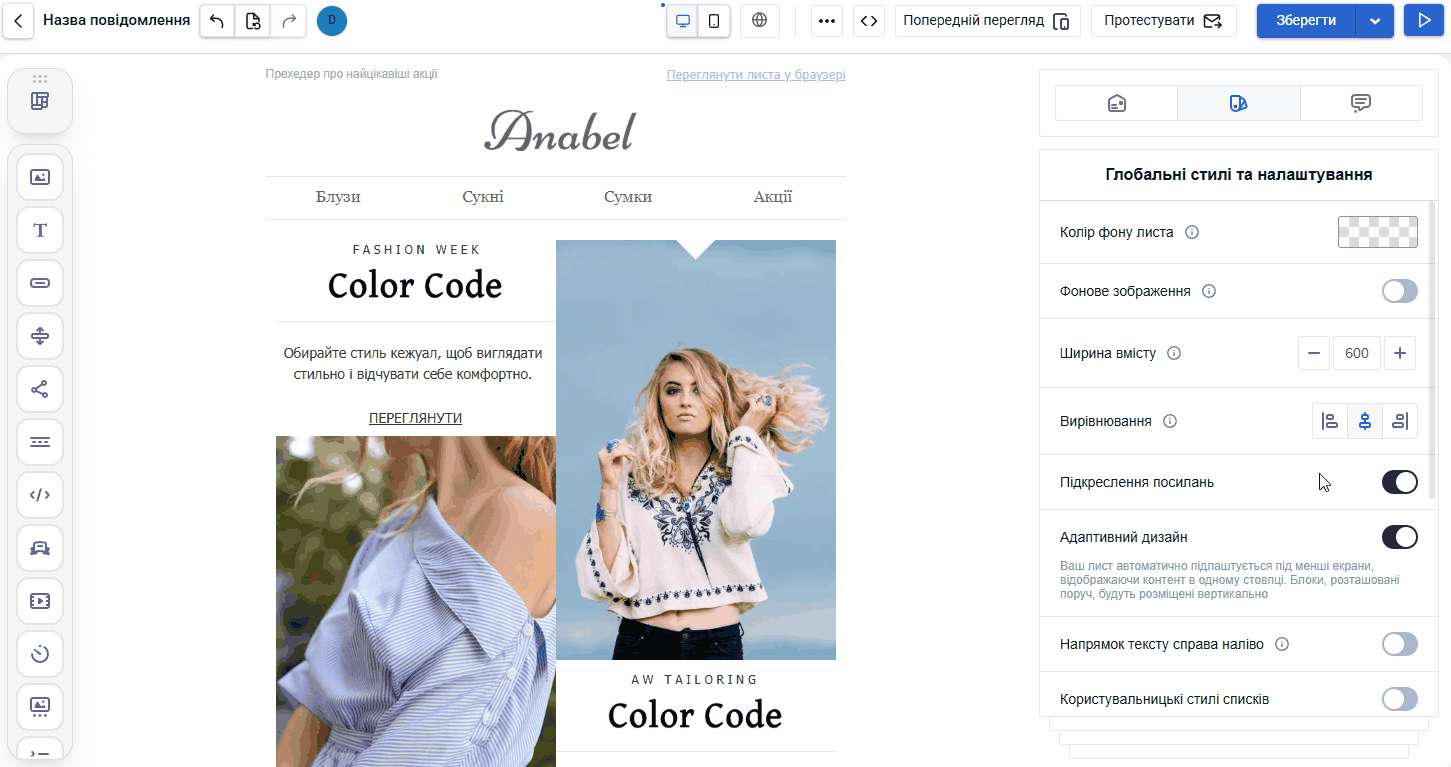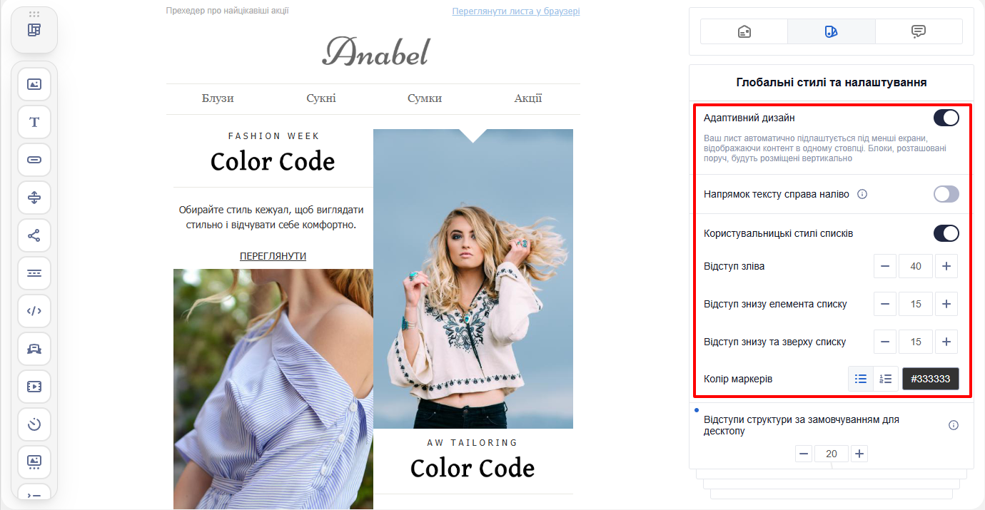 Ширина вмісту — оптимальна ширина листа для коректного відображення на різних пристроях, за замовчуванням 600 px.