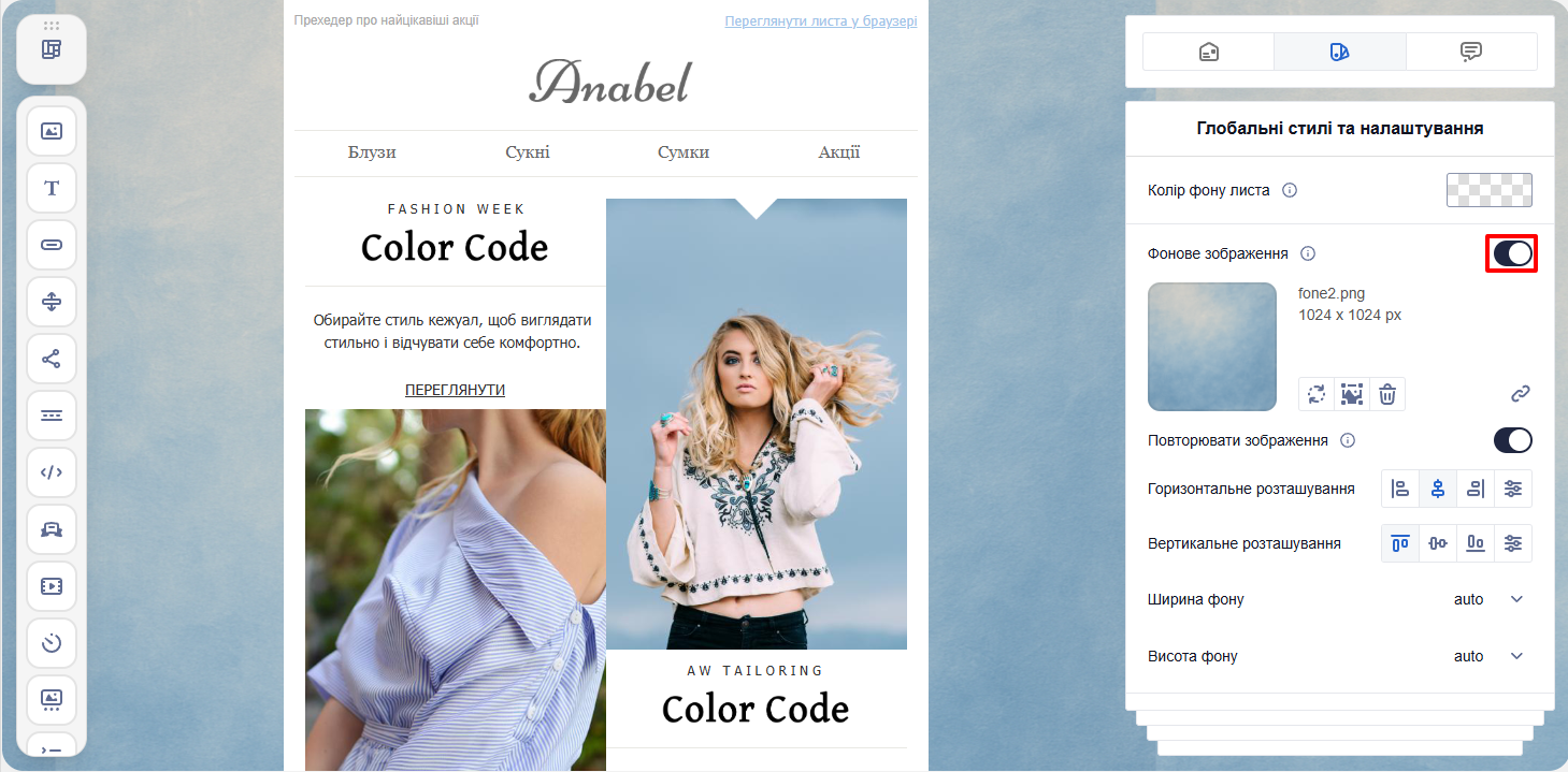ПриміткаДеякі поштові клієнти не відображають фонові зображення (наприклад, Windows 10 Mail, старі Android Mail, мобільний Gmail тощо). Рекомендуємо в такому разі задати схожий колір фону як резервний варіант. Це забезпечить читабельність, якщо картинка не завантажиться.