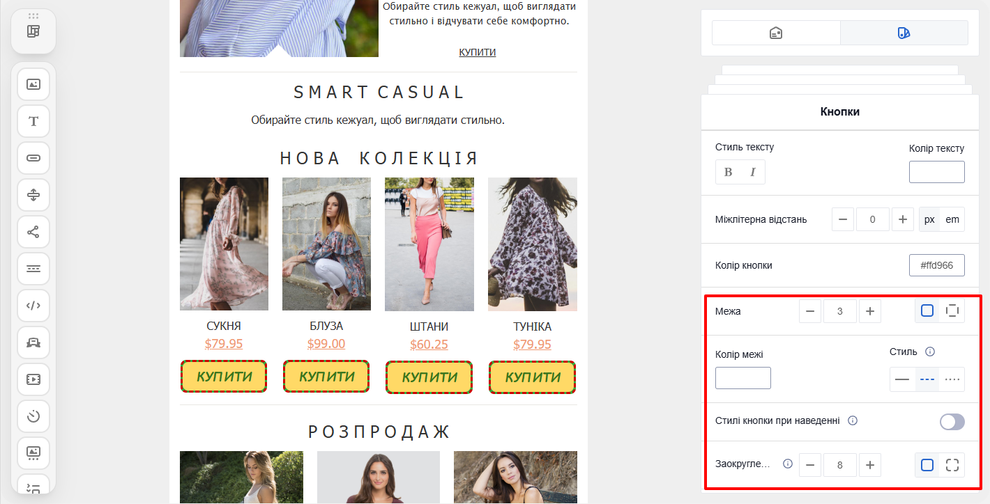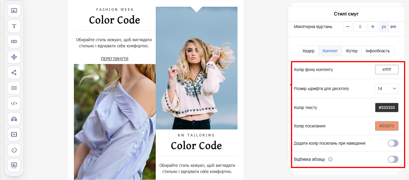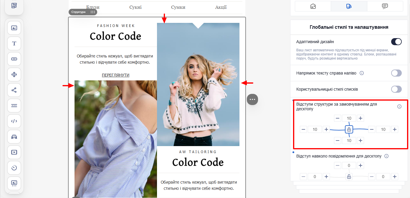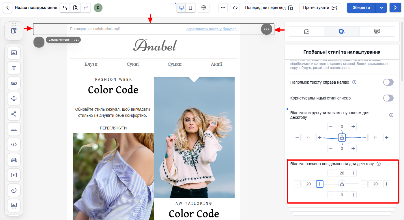 ВажливоПід час створення повідомлення можна редагувати будь-який елемент окремо — смугу, структуру, контейнер або блок. Якщо для елемента задані власні налаштування, вони мають пріоритет над загальними, і саме вони відображатимуться у листі.