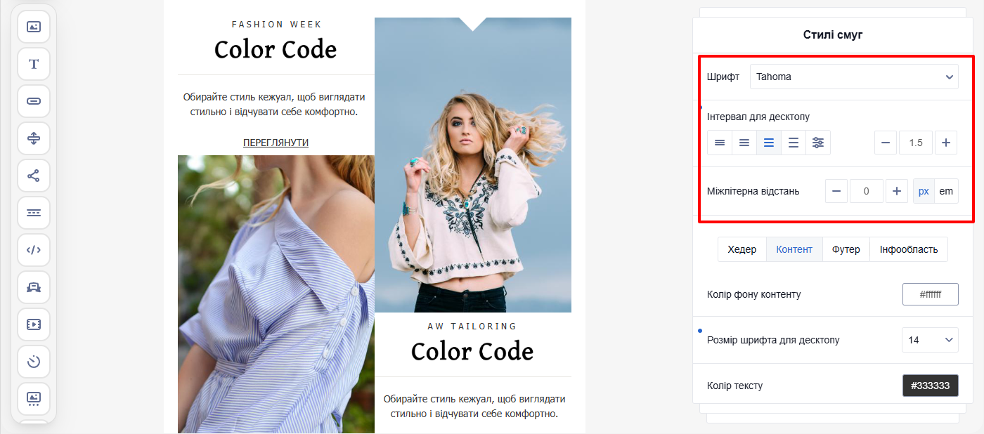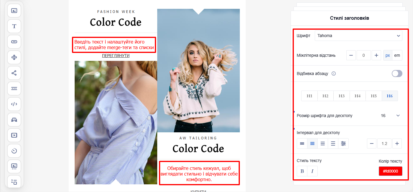 Налаштуйте зовнішній вигляд всіх заголовків у листі (H1–H6) — шрифт, міжлітерну відстань, відбивку абзацу, розмір шрифту та інтервал для десктопу, стиль та колір тексту.