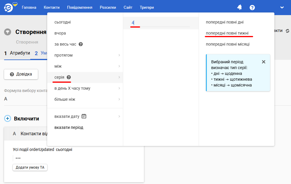 Серія – використовується для перевірки регулярності подій і дає змогу сегментувати користувачів, які залишаються активними. Подія має виконуватися щонайменше один раз у кожному з N повних попередніх періодів за UTC (день, тиждень або місяць).