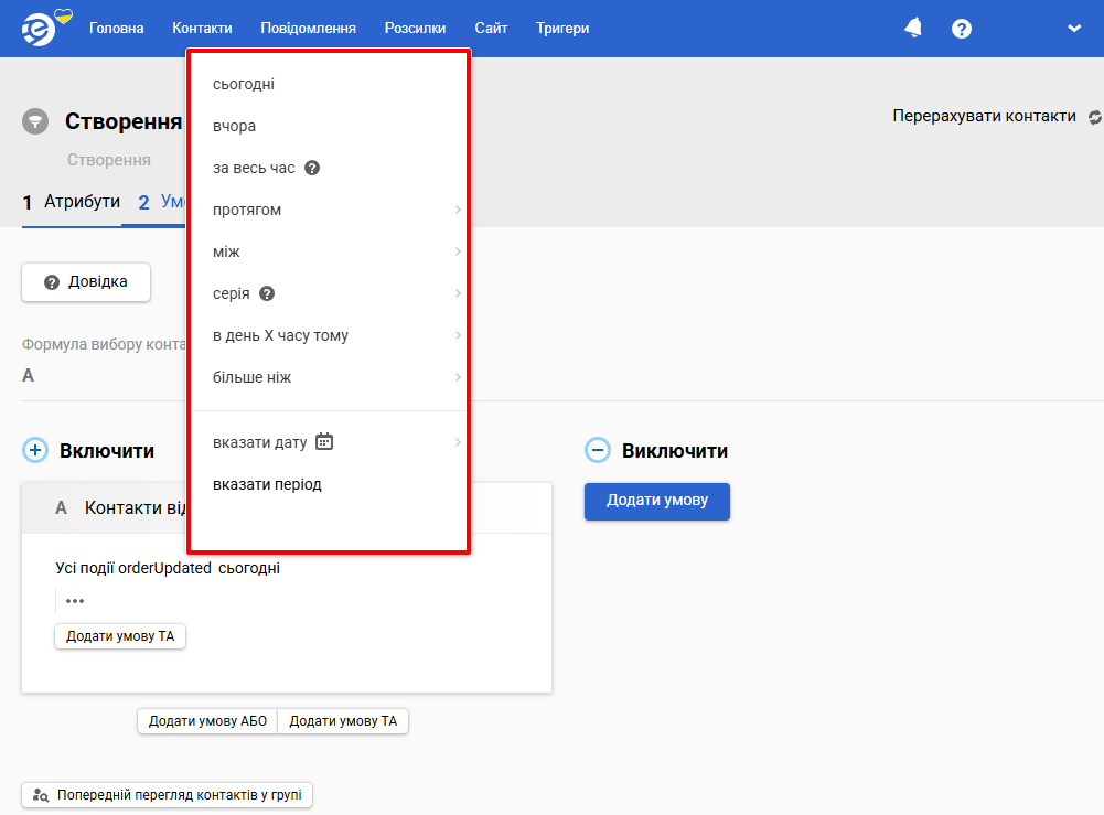 Для формування сегментів за подіями, які відображають термін життєвого циклу клієнта, використовуйте умови: