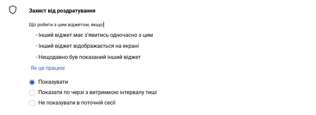 - Не показувати в поточній сесії. Віджет буде показаний на сайті, якщо одночасно не відображається інший. Якщо на екрані знаходиться інший віджет або увімкнено інтервал тиші, віджет не відобразиться на сайті.