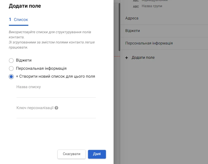 Щоб додати нове поле у вікні Виберіть поле контакту: