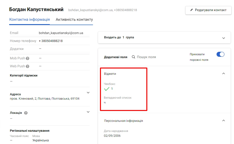 Коли користувач вводить дані в поля та підписується за допомогою віджета, створюється новий контакт. Якщо контакт вже існує, дані додаються до відповідних полів і контакт оновлюється.