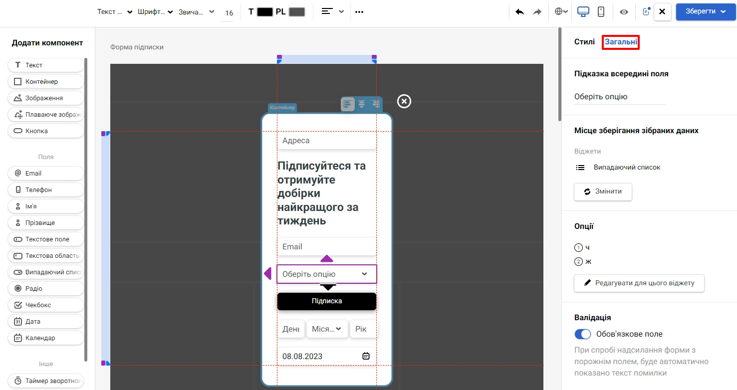 Після додавання поля до віджета ви можете редагувати його налаштування, які доступні на вкладці Загальні і залежать від типу віджета.