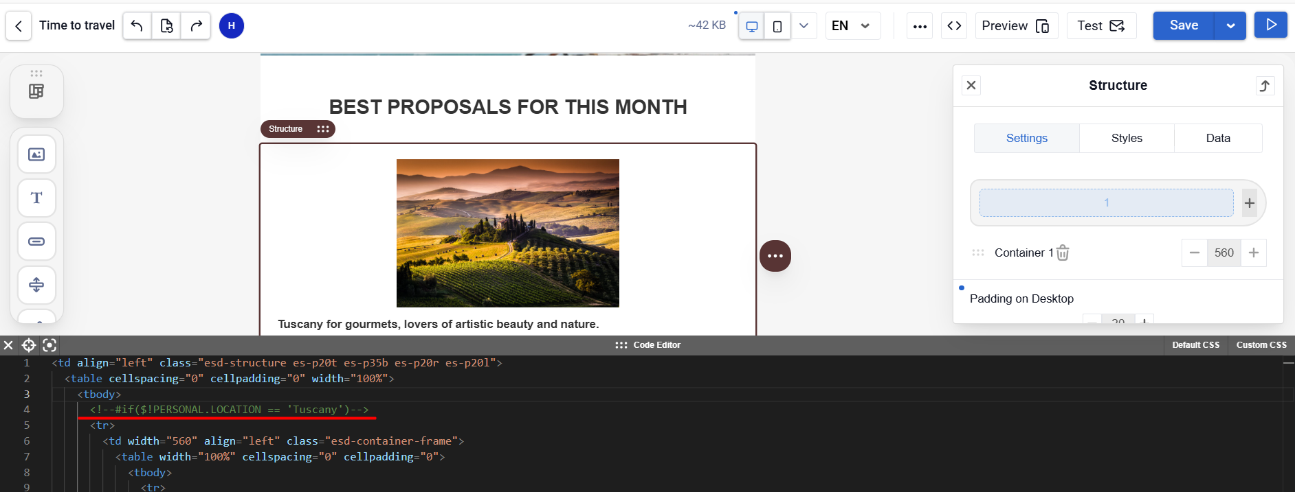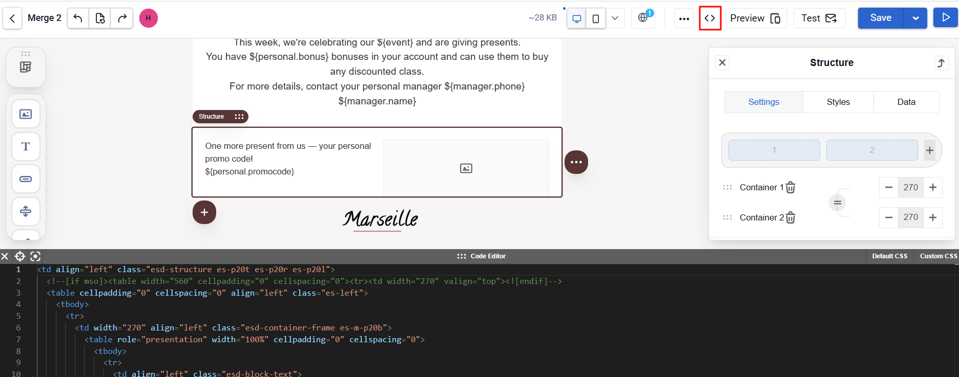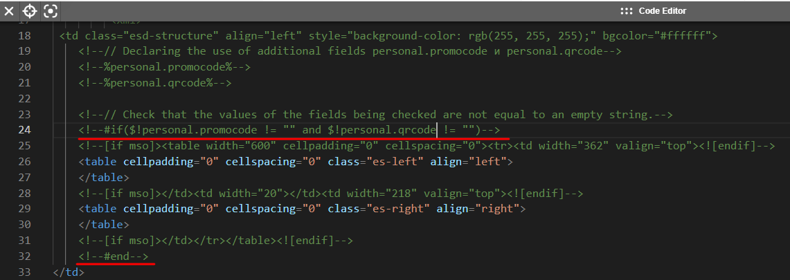 У нашому випадку блок буде виводиться, тільки якщо в полях контакту є і QR-код, і персональний промокод. Якщо немає хоча б одного з двох складових, то цей блок взагалі не виведеться в листі. Для цього необхідно звернутися до додаткових полей і перевірити їх значення. Виділіть потрібну структуру і перейдіть в режим редагування коду повідомлення:
