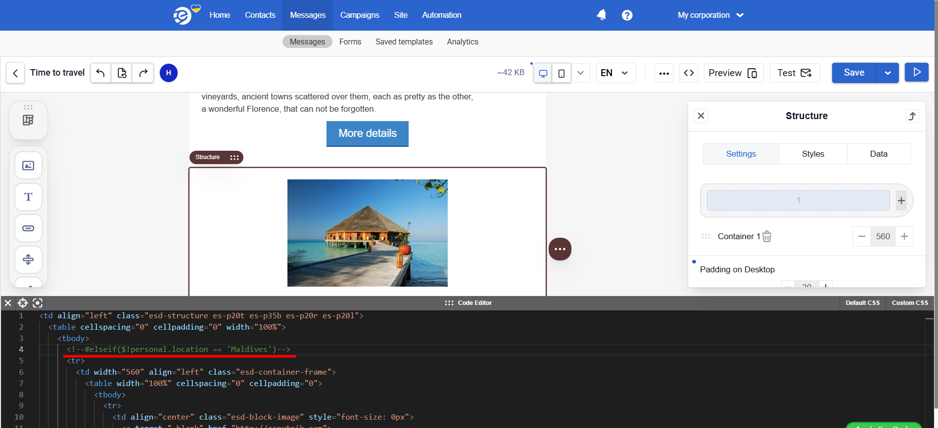 - Клікніть на другу структуру шаблону, в якій потрібно відобразити динамічний контент (Мальдіви). Код цієї структури буде показано у редакторі коду.