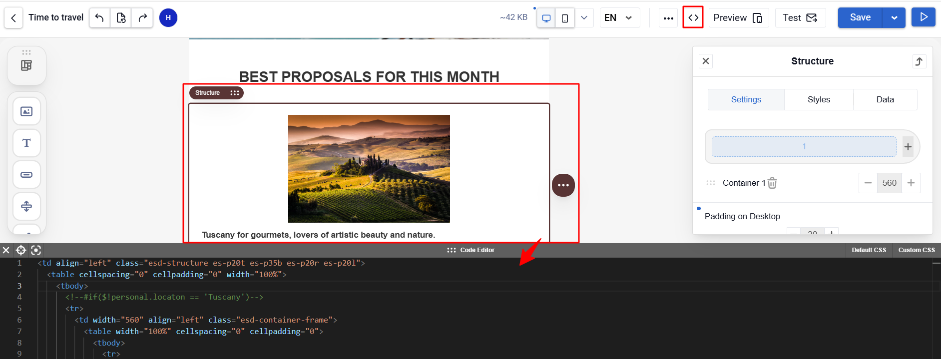 Натисніть на першу структуру в листі, в якій ви хочете відобразити динамічний контент (Тоскана), і відкрийте редактор коду.