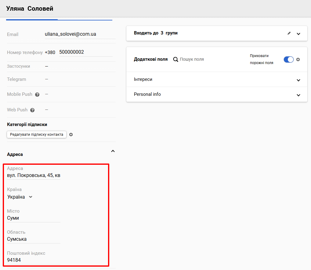 Поля контактів використовуються для зберігання та збору інформації про ваших підписників та клієнтів, наприклад імені, дати народження, місцезнаходження і т.д. Ви можете використовувати ці дані для створення сегментів аудиторії або персоналізації вмісту повідомлень.