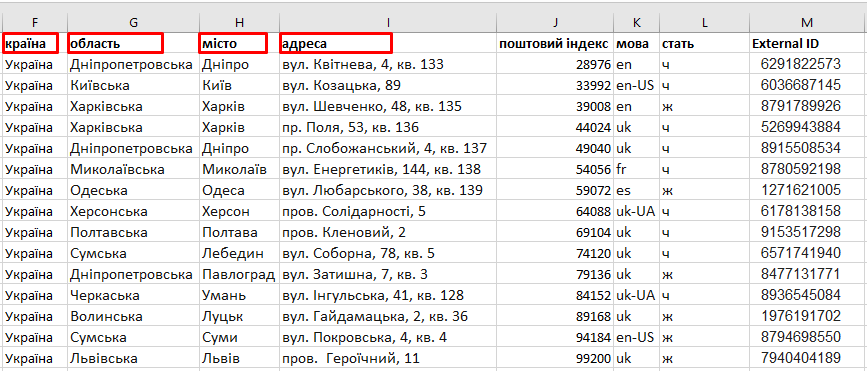 Якщо ви імпортуєте файл, що містить дані про країну, значення мають передаватися у форматі ISO 3166-1 alpha-2 (наприклад, UA, DE, FR).