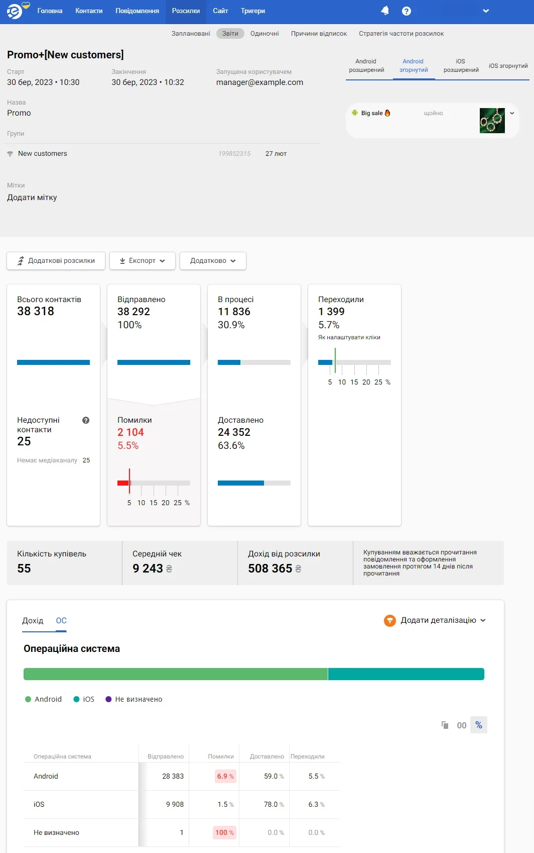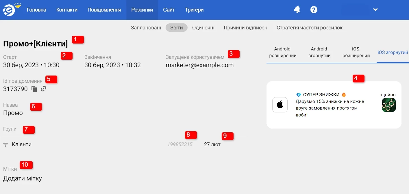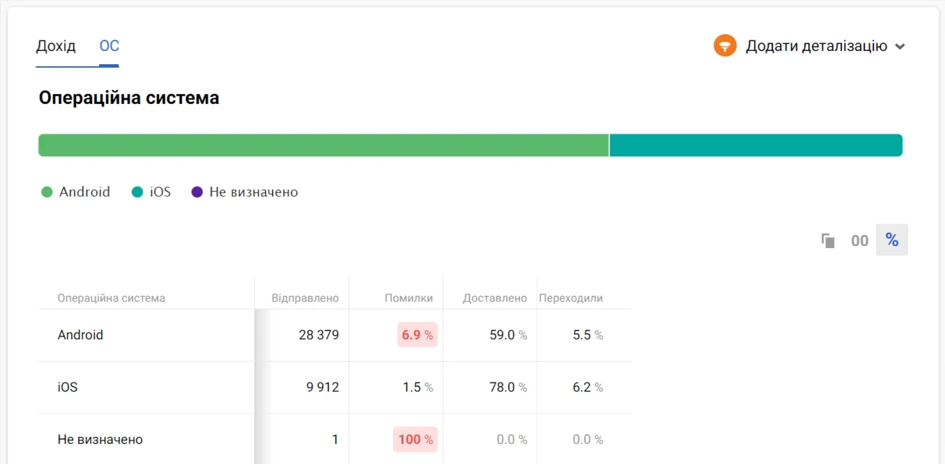 Звіти з пуш-кампаній надають інформацію про результати розсилки, включно із ключовими показникам і операційними системами отримувачів повідомленя.