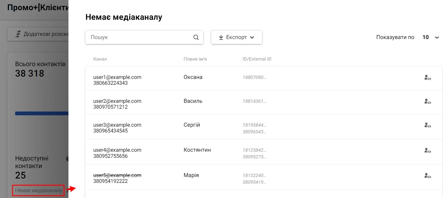 - Експорт. Дозволяє вивантажити контакти зі звіту у CSV-файл, до існуючого або нового списку. Експорт доступний за всіма показниками розсилки: відправлені, доставлені, недоступні контакти на момент відправлення, понад ліміт тарифного плану, перевищено рівень занепокоєння тощо.