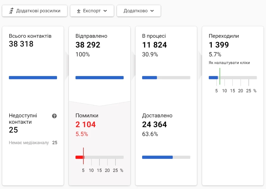 На головному екрані зі статистикою знаходитьсядокладна інформація щодо недоступних контактів, відправлених, доставлених та відкритих повідомлень, та контактів, що знаходяться у процесі отримання повідомлення або не отримали його через помилки.
