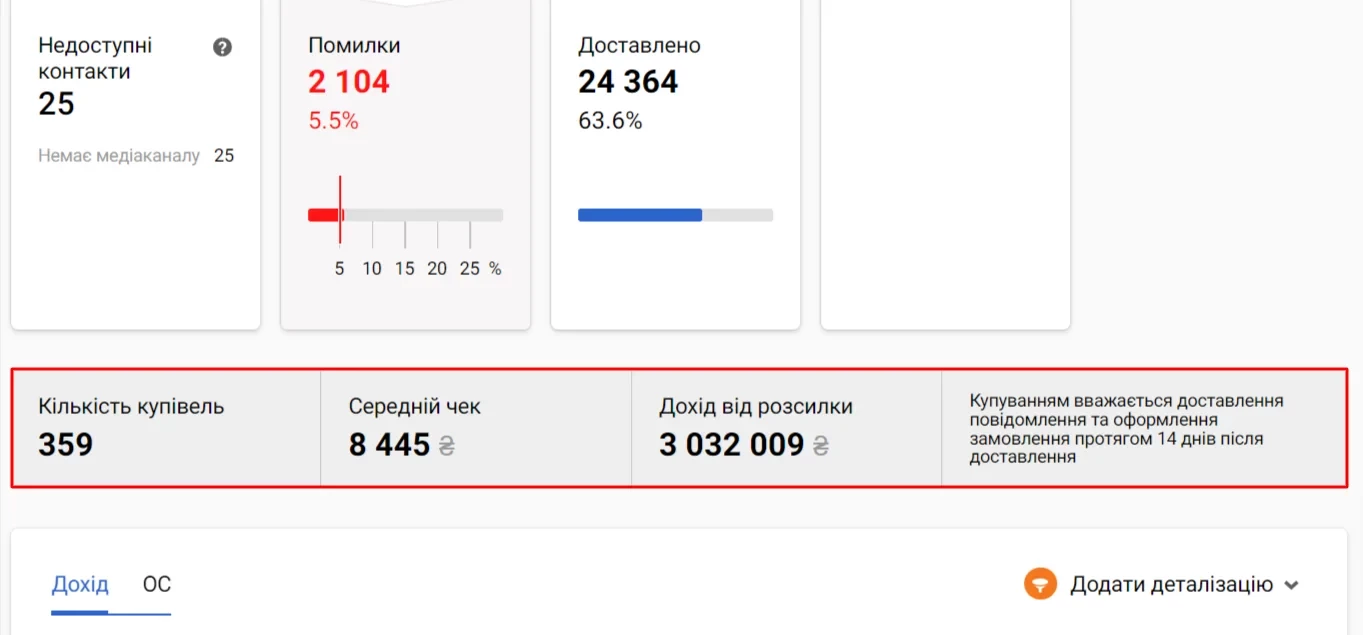 Якщо ви налаштували передачу даних про замовлення до eSputnik, у звіті з'являться дані про кількість покупок, середній чек та загальний дохід від розсилки.