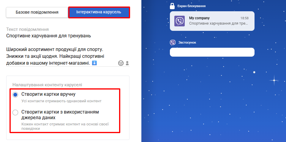 - З використанням джерела даних — кожен контакт отримає персоналізований контент на основі своєї поведінки (наприклад, переглянуті товари, покинутий кошик тощо). Докаладніше у статті Рекомендації у Viber-повідомленнях >